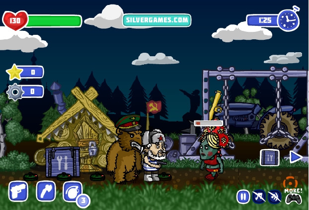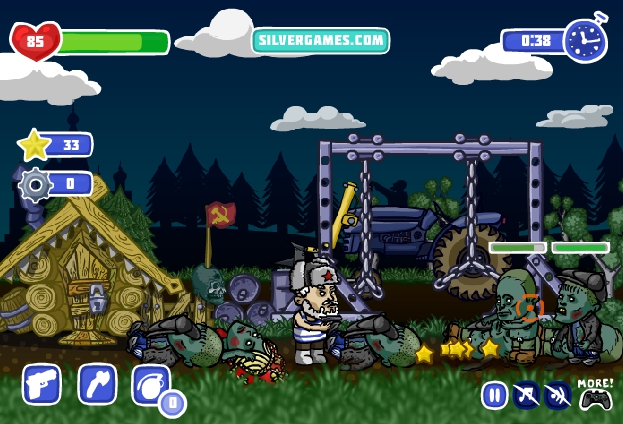 Игра Зомби пожирают Родину перенесет тебя в Сибирь. Ходячие мертвецы забрались так далеко, ведь им и мороз нипочем. Однако им не повезло, ведь на их отстрел выходит простой сибирский мужик в ушанке. У него в арсенале разные способы истребления гниющих зомби: различное огнестрельное оружие, топор, гранаты и многое другое. Прокачивай убийцу нежити без регистрации в режиме онлайн. Обороняй свой дом и собирай ящики с полезными вещами, а Родина пусть спокойно спит.